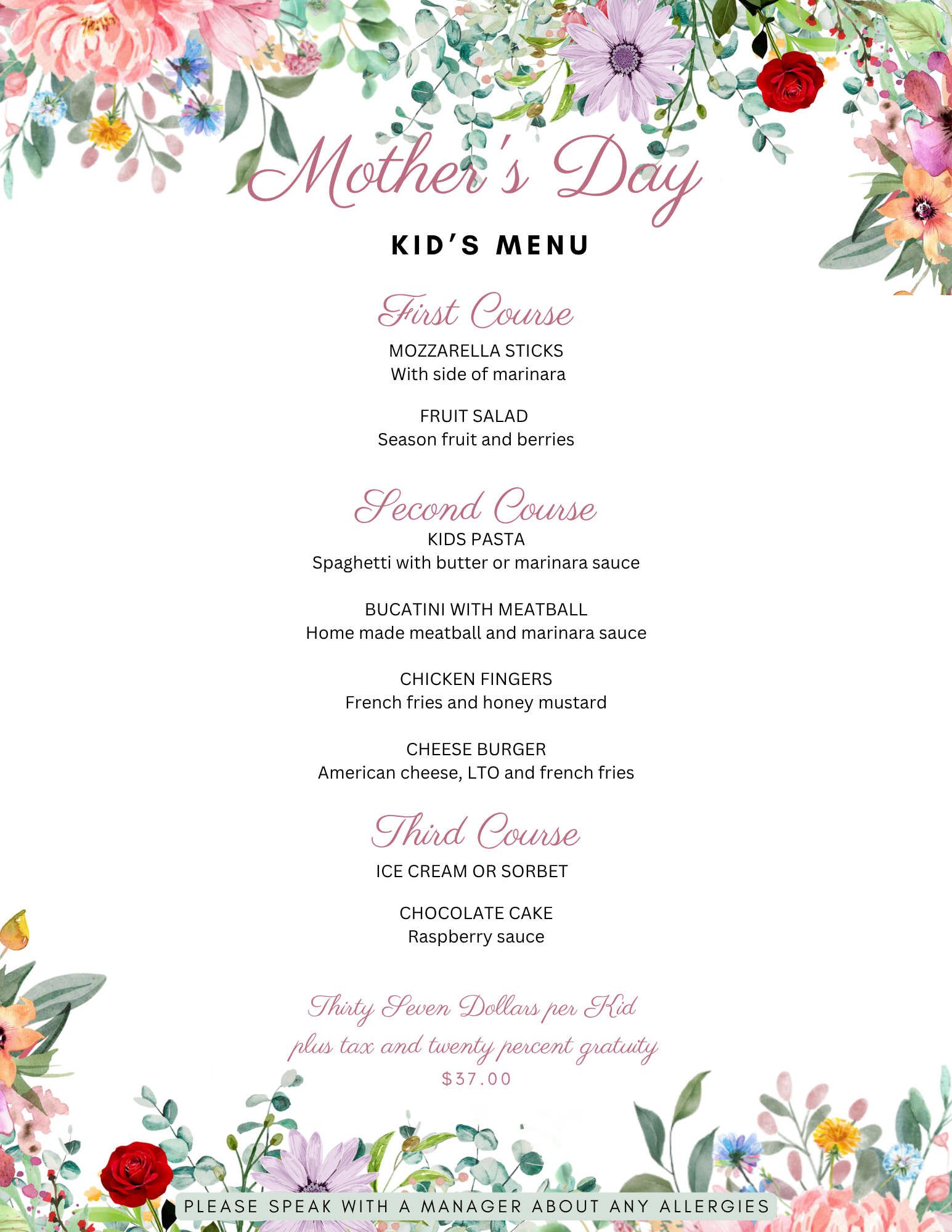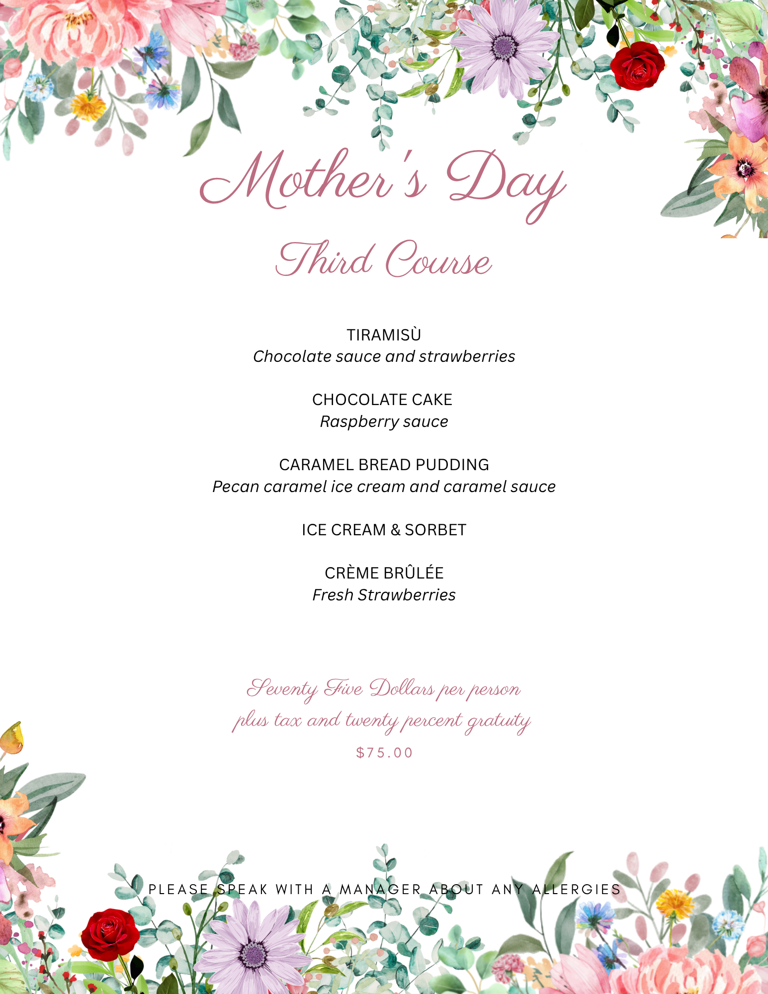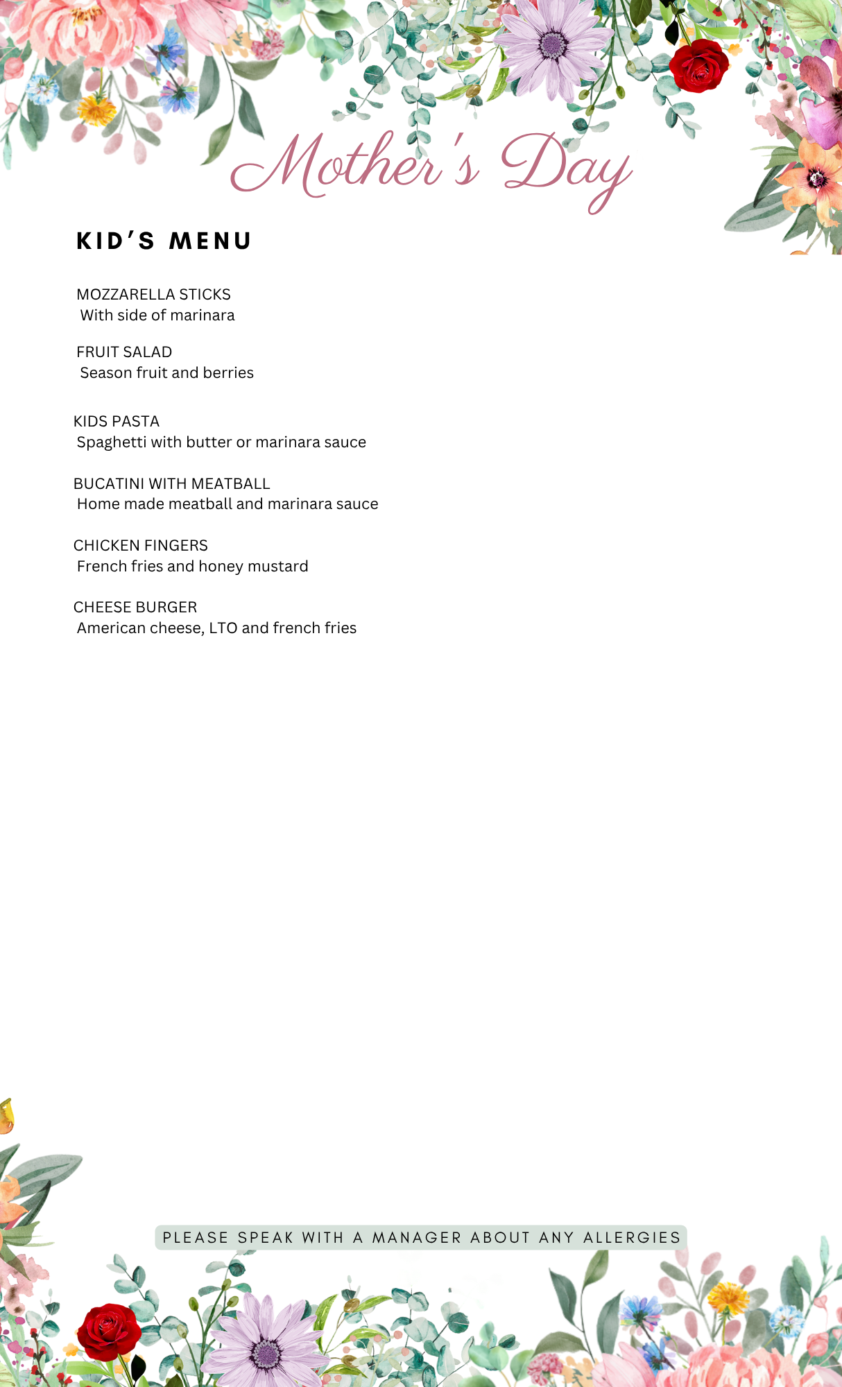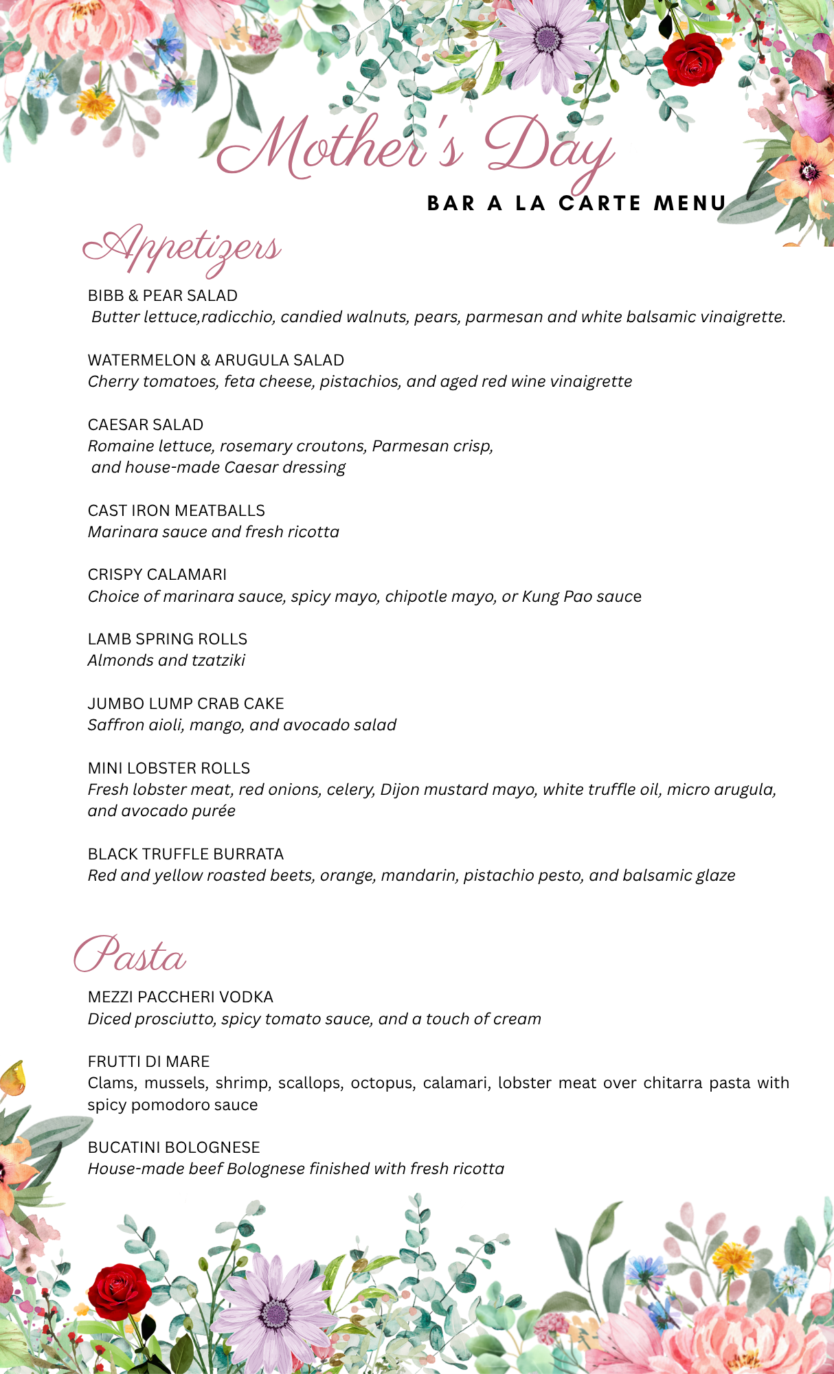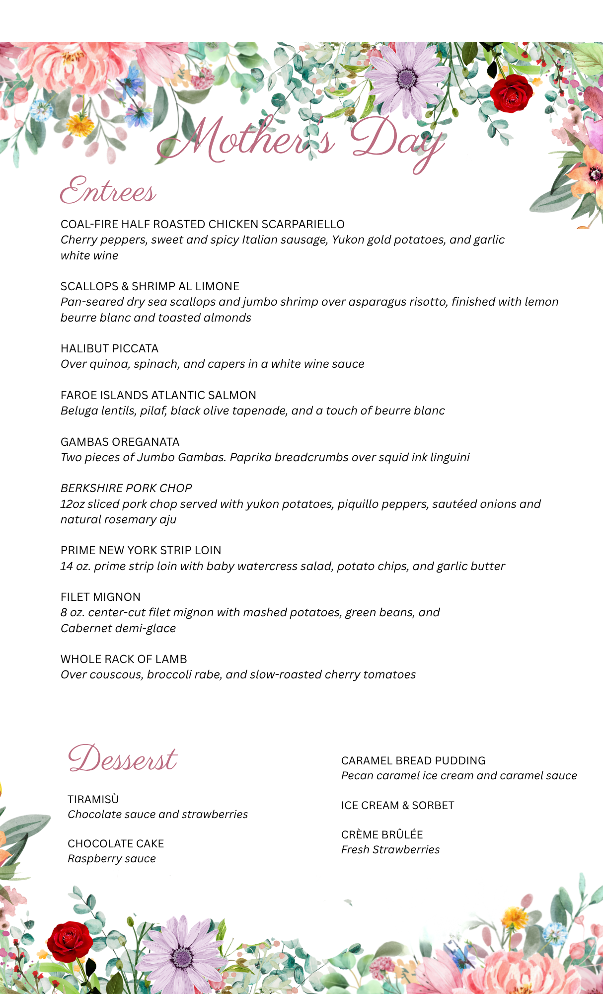 Join us for Mother’s Day Sunday May 10th, 202611:00 am to 9:00 pm Mother’s Day at Kenny’s on the WaterThree Course Prix Fixe MenuA la Carte Menu Available at the Bar Only Reserve a table and dine with us! Reservations